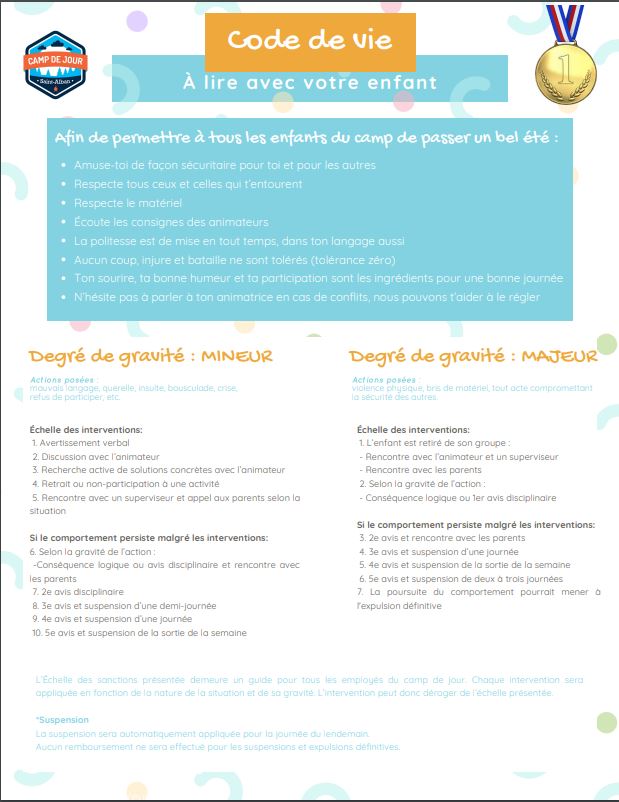 Le non respect du code de vie entraîne une expulsion du camp sans remboursement possible.