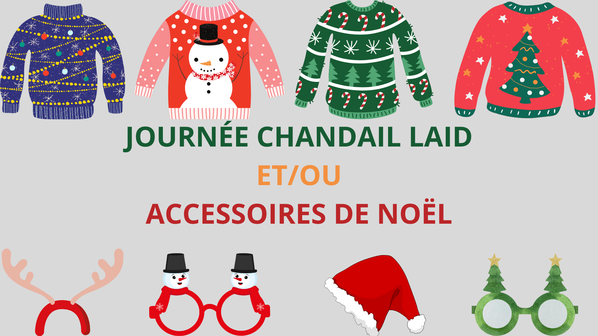 Mercredi 4 décembre : JOURNÉE CHANDAIL LAID ET/OU ACCESSOIRES DE NOËL!!!! Portez vos plus beaux chandails laids et/ou accessoires de Noël et envoyez vos photos!!!
