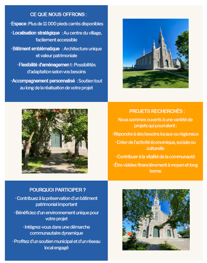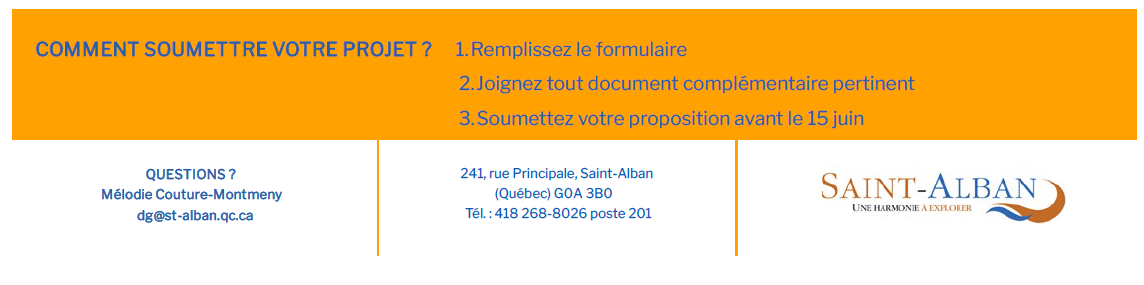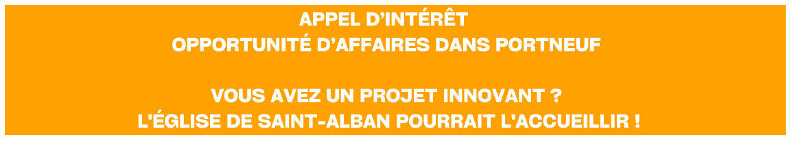 La municipalité de St-Alban est heureuse d'annoncer qu'elle lance un appel d'intérêt, afin d'inviter les entrepreneurs et les organismes de toutes régions à présenter la vision de leur projet d'utilisation de l'Église de St-Alban. Cette démarche s'inscrit dans le processus de transformation de l'Église localisée à St-Alban, et vise à permettre aux entrepreneurs et aux organismes de faire valoir leurs ambitions dans l'utilisation potentielle des locaux en question. Les entreprises ou les organismes intéressés doivent déposer leur projet à l'intention de Mme, Mélodie Couture-Montmeny, Directrice générale, avant le 15 juin 2025 en remplissant le Formulaire - Appel d'intérêts